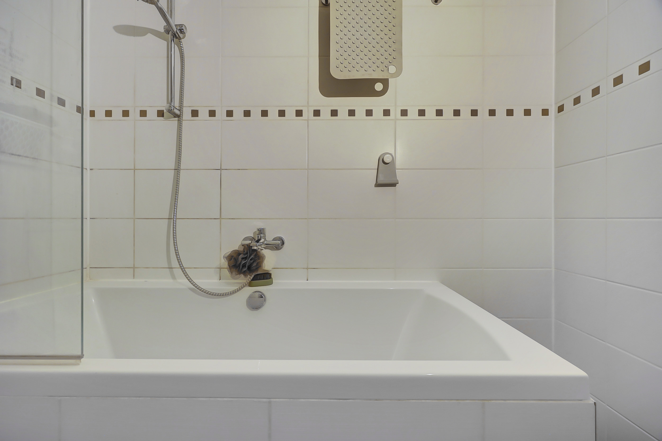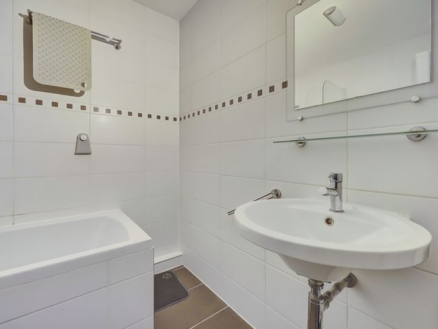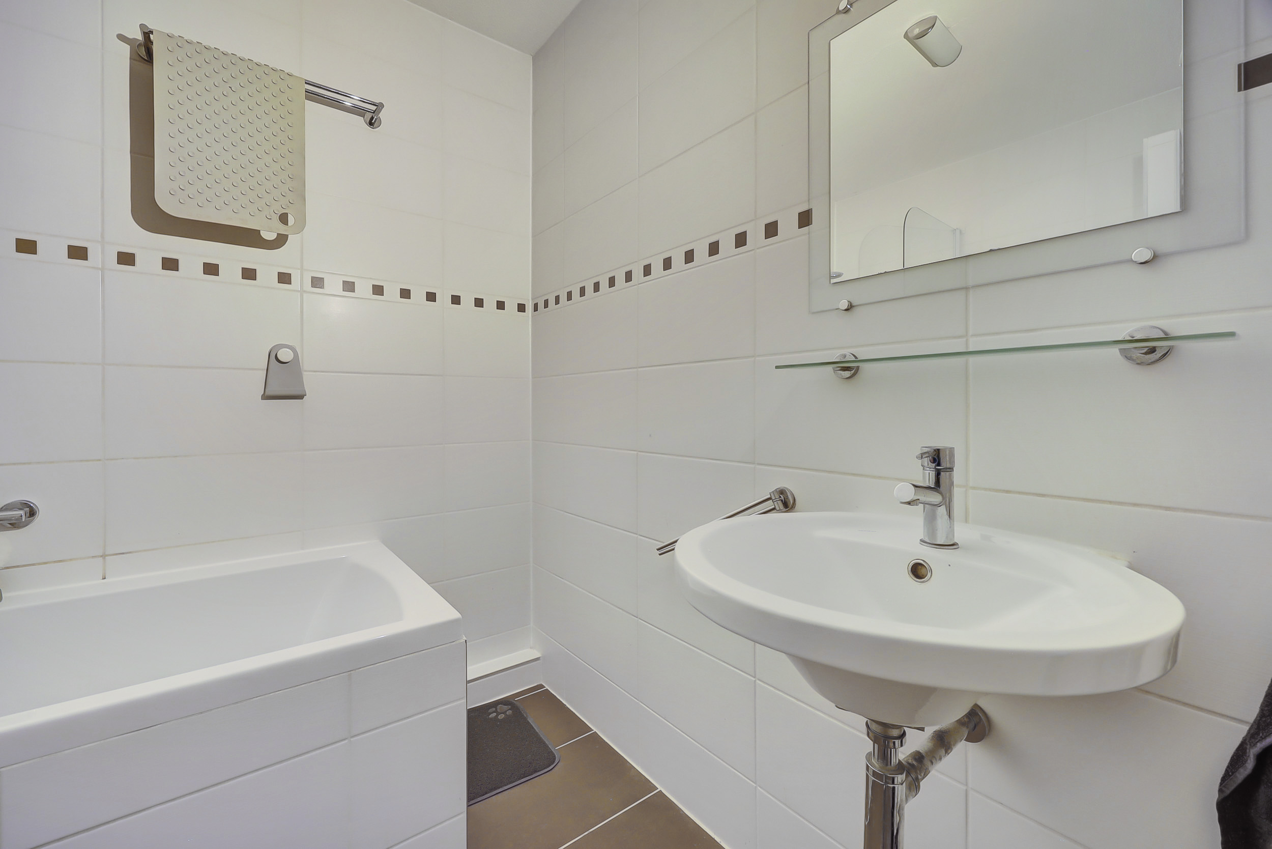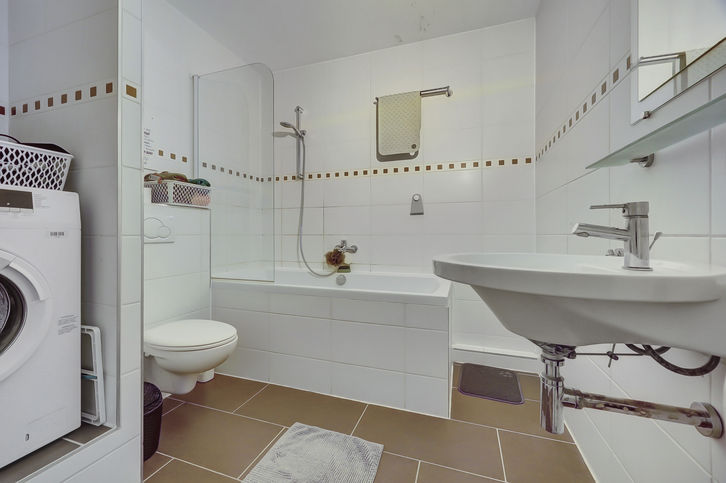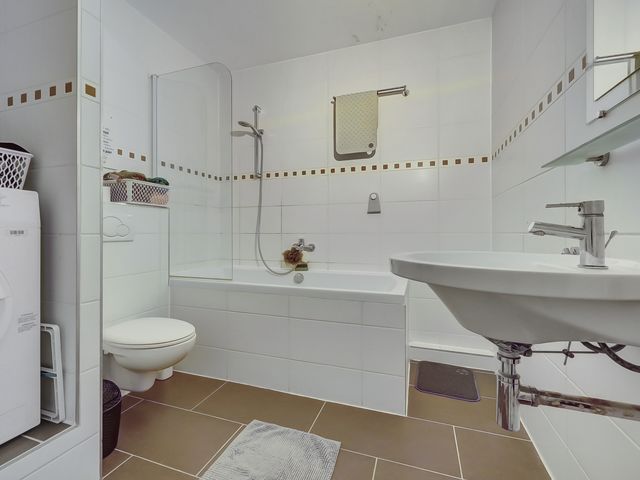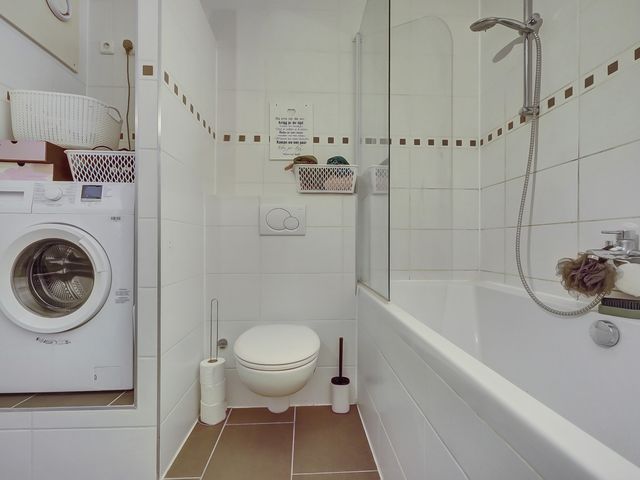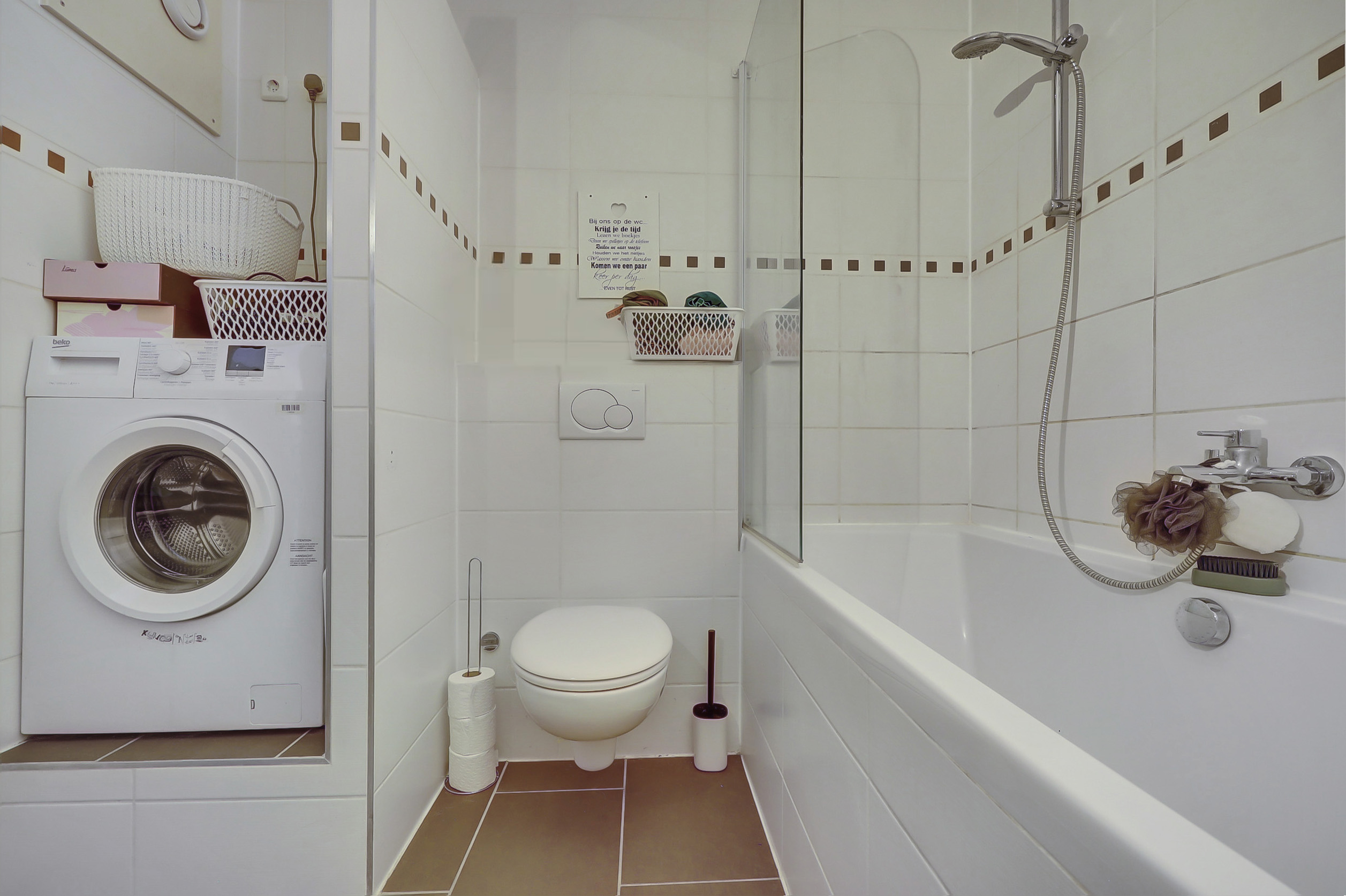 Komende bij de badkamer met een ligbad, toilet, wastafel en de aansluiting voor de wasmachine.