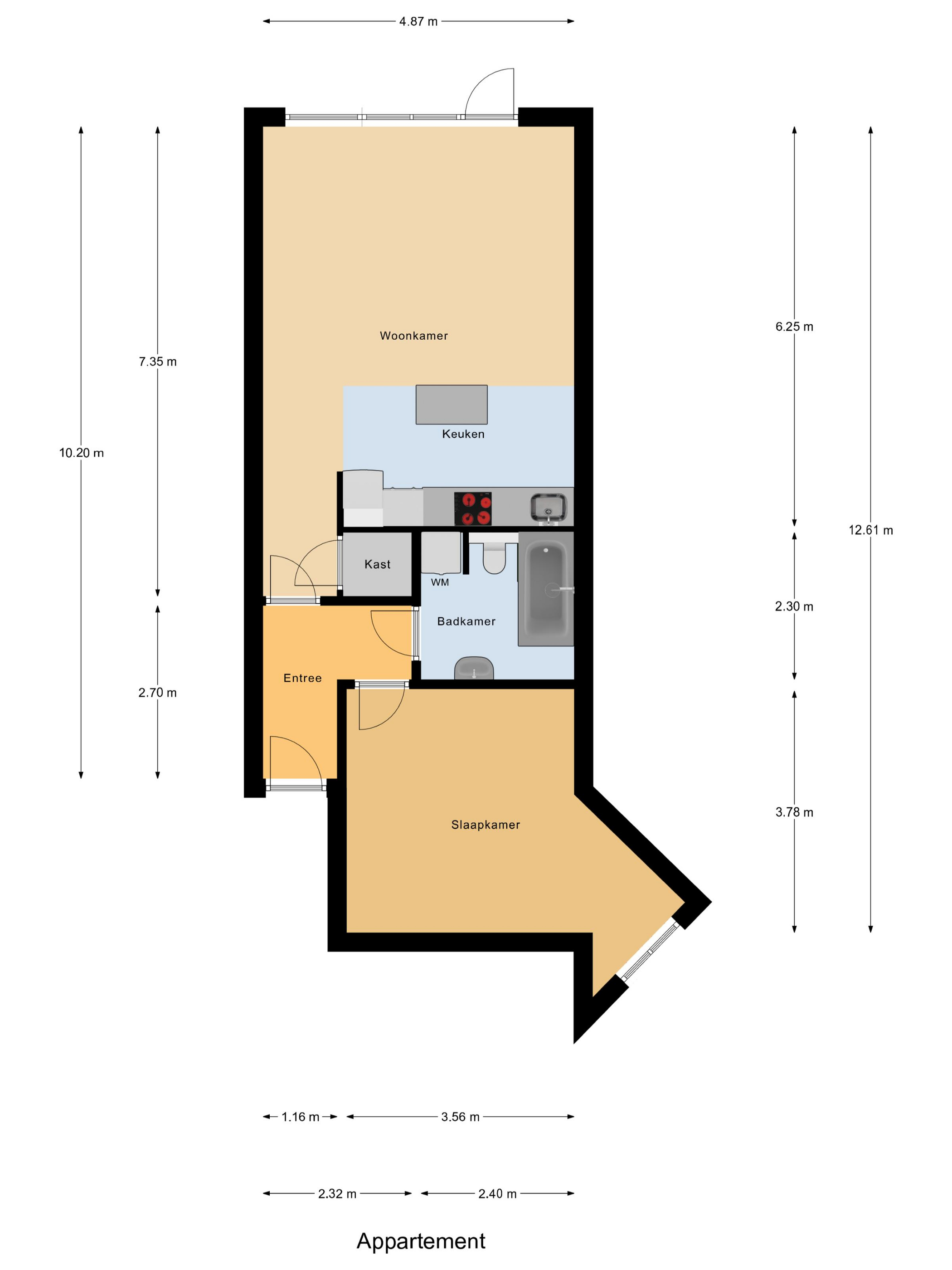 Via een trapopgang bereik je het appartement. Je komt binnen in de hal welke toegang geeft tot alle vertrekken.
