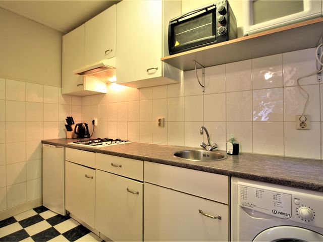De keuken is naast het kookgerei voorzien van gaskookplaat, oven, magnetron, koelkast met vriesvak, wasmachine en
