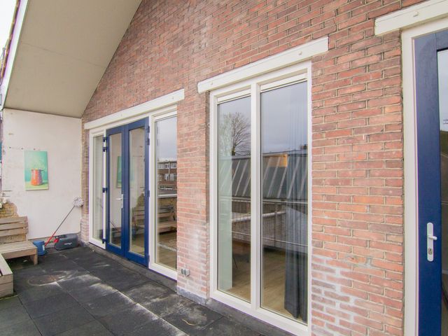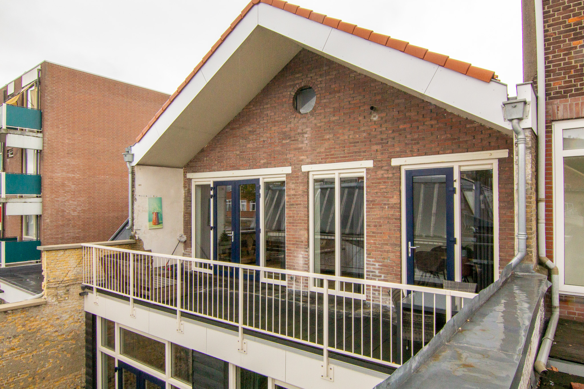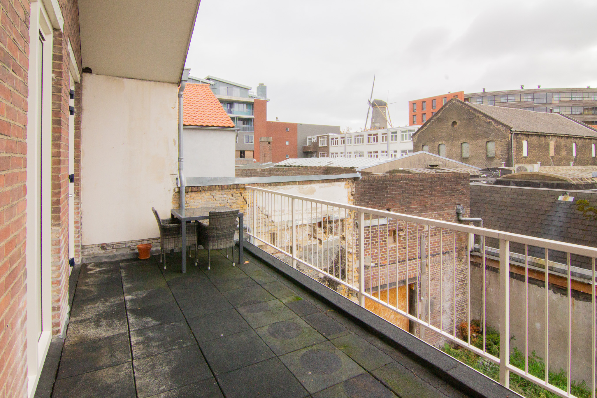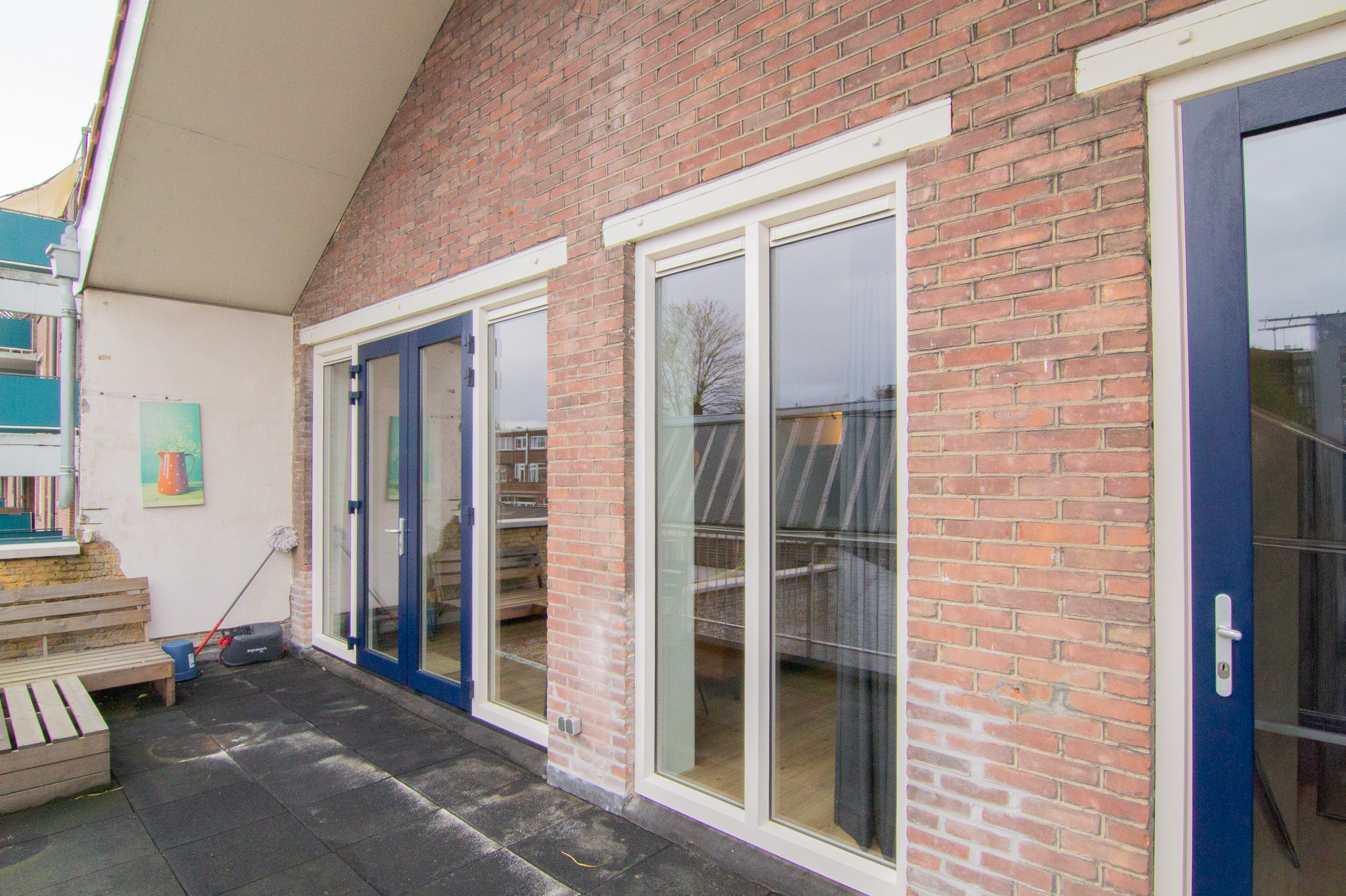Via de openslaande deuren in de woonkamer bereiken we het dakterras. Deze is gelegen op het zuidoosten.