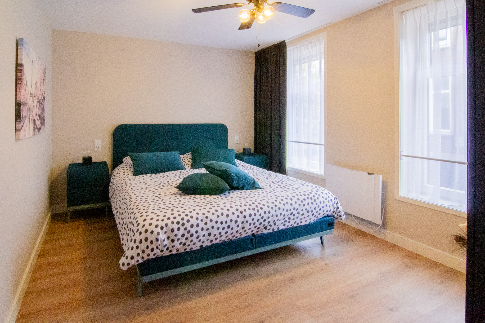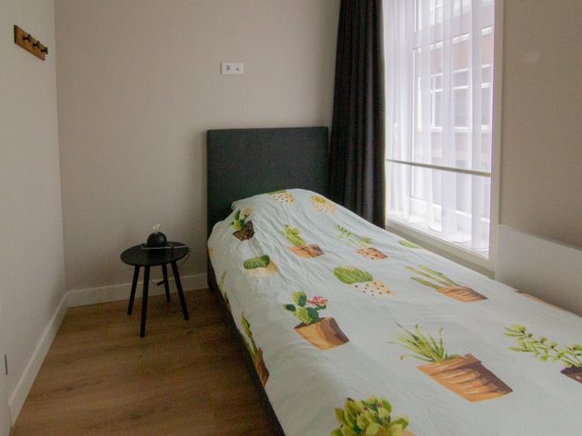 Er zijn 2 slaapkamers aanwezig van respectievelijk 13m2 en 7m2. In de grote slaapkamer stat een tweepersoonsbed en in de kleine slaapkamer een eenpersoonsbed. Beide kamer hebben een kleidingkast.
