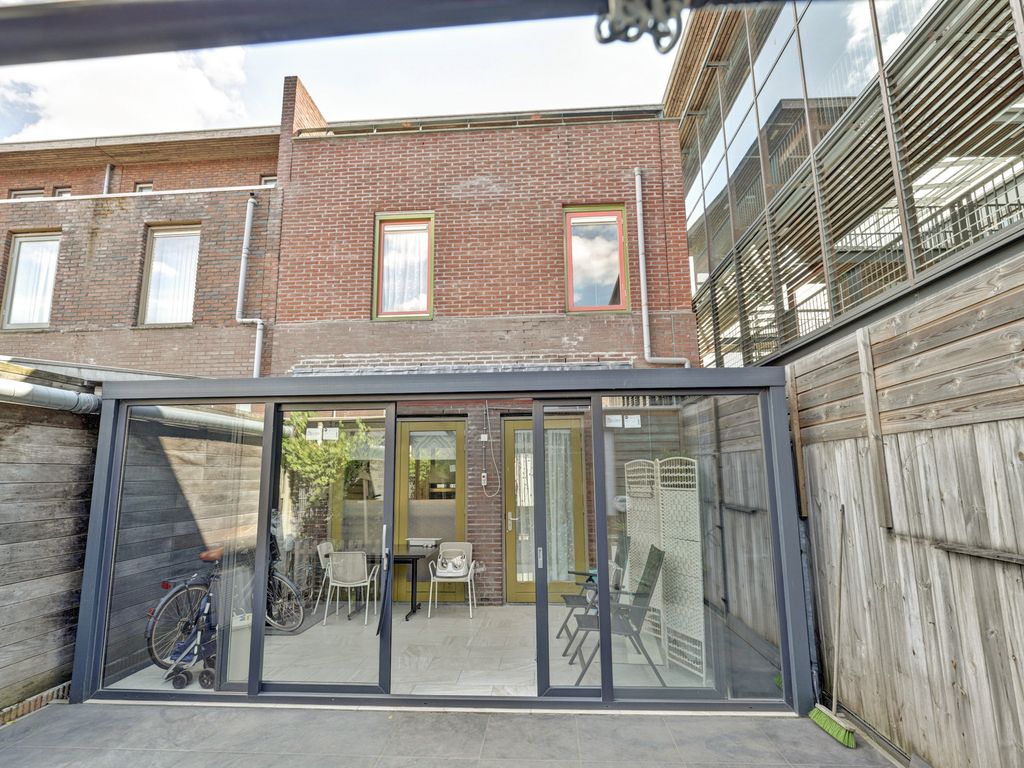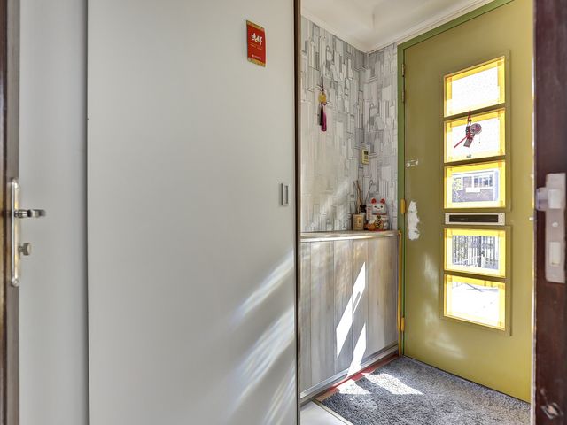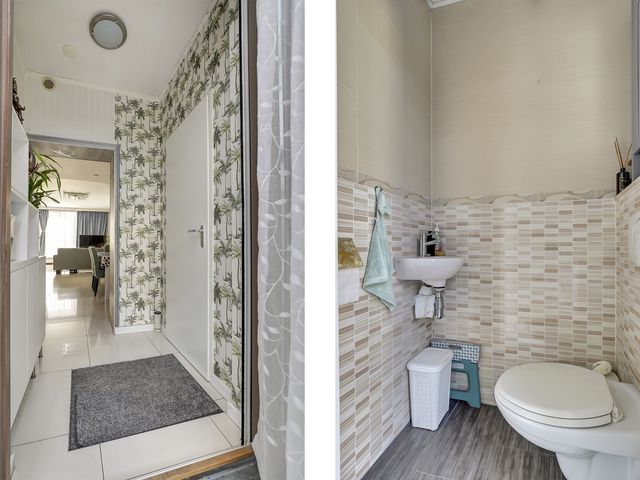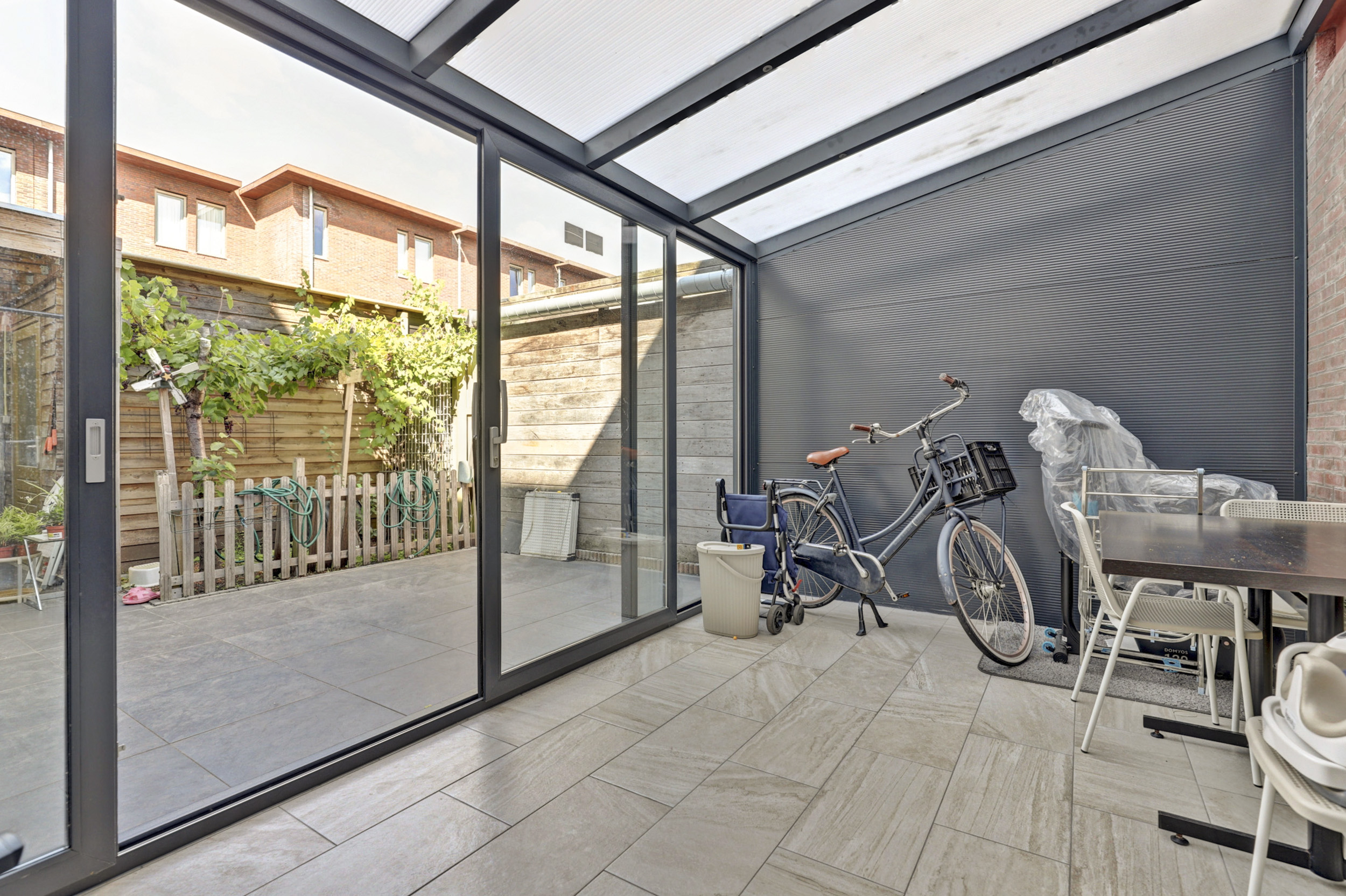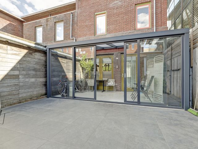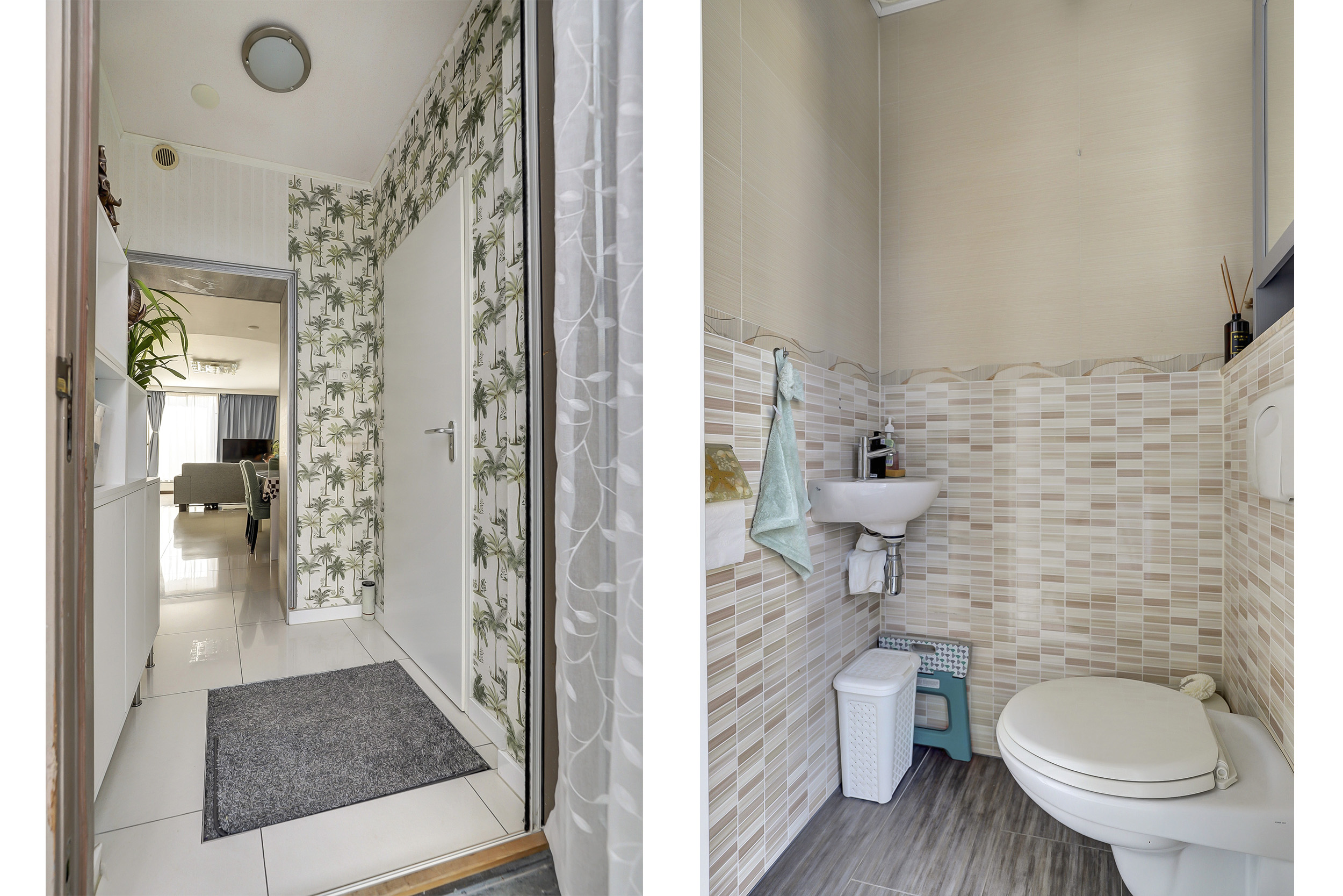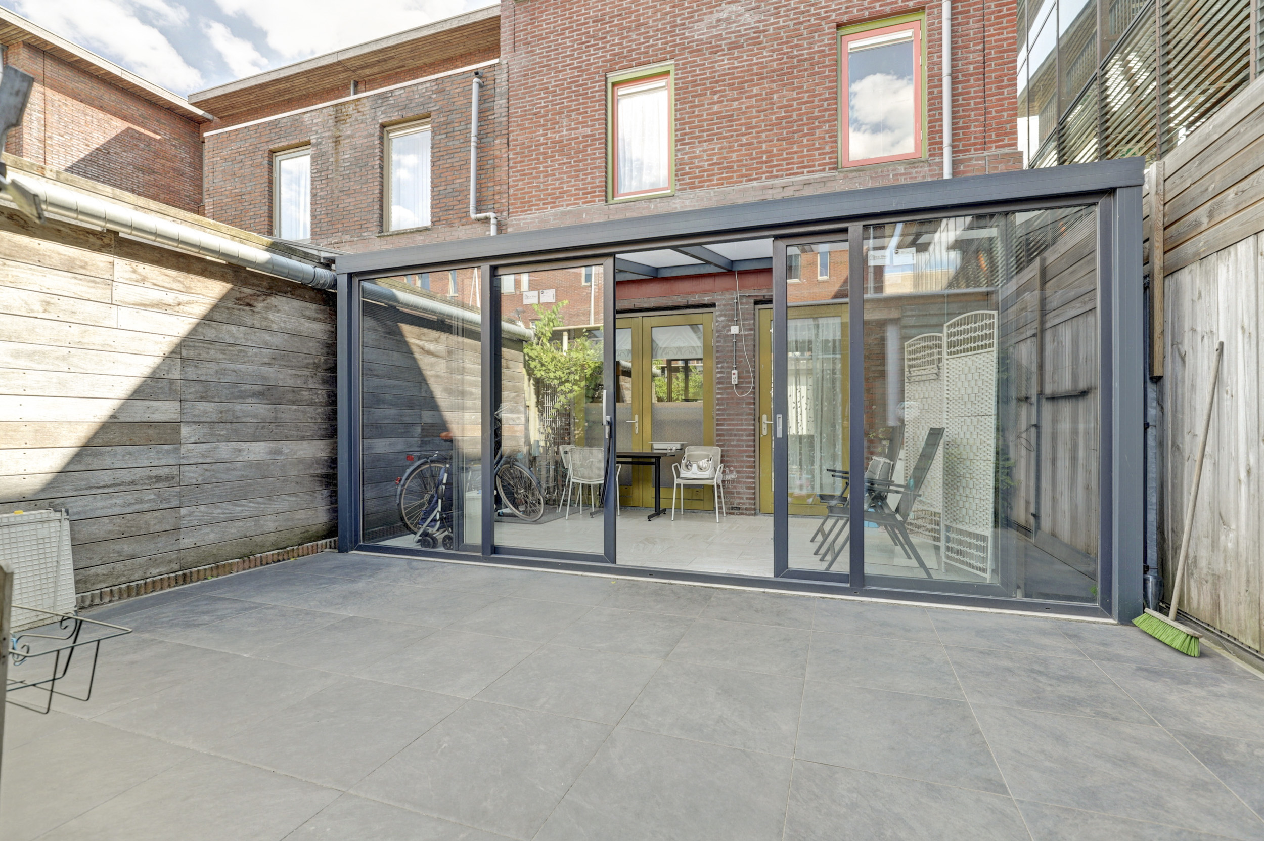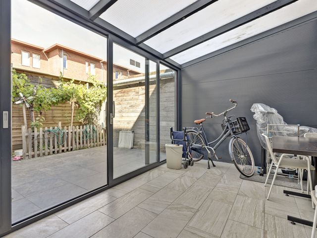 Vanuit de woonkamer kom je bij een tussenhal waar het toilet zich bevindt en je toegang hebt tot de serre. De serre is omgeven met glas en schuifdeuren en geeft je toegang tot de tuin.