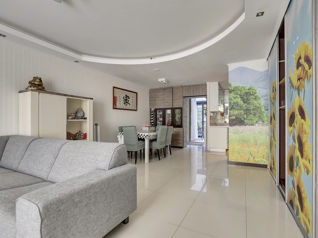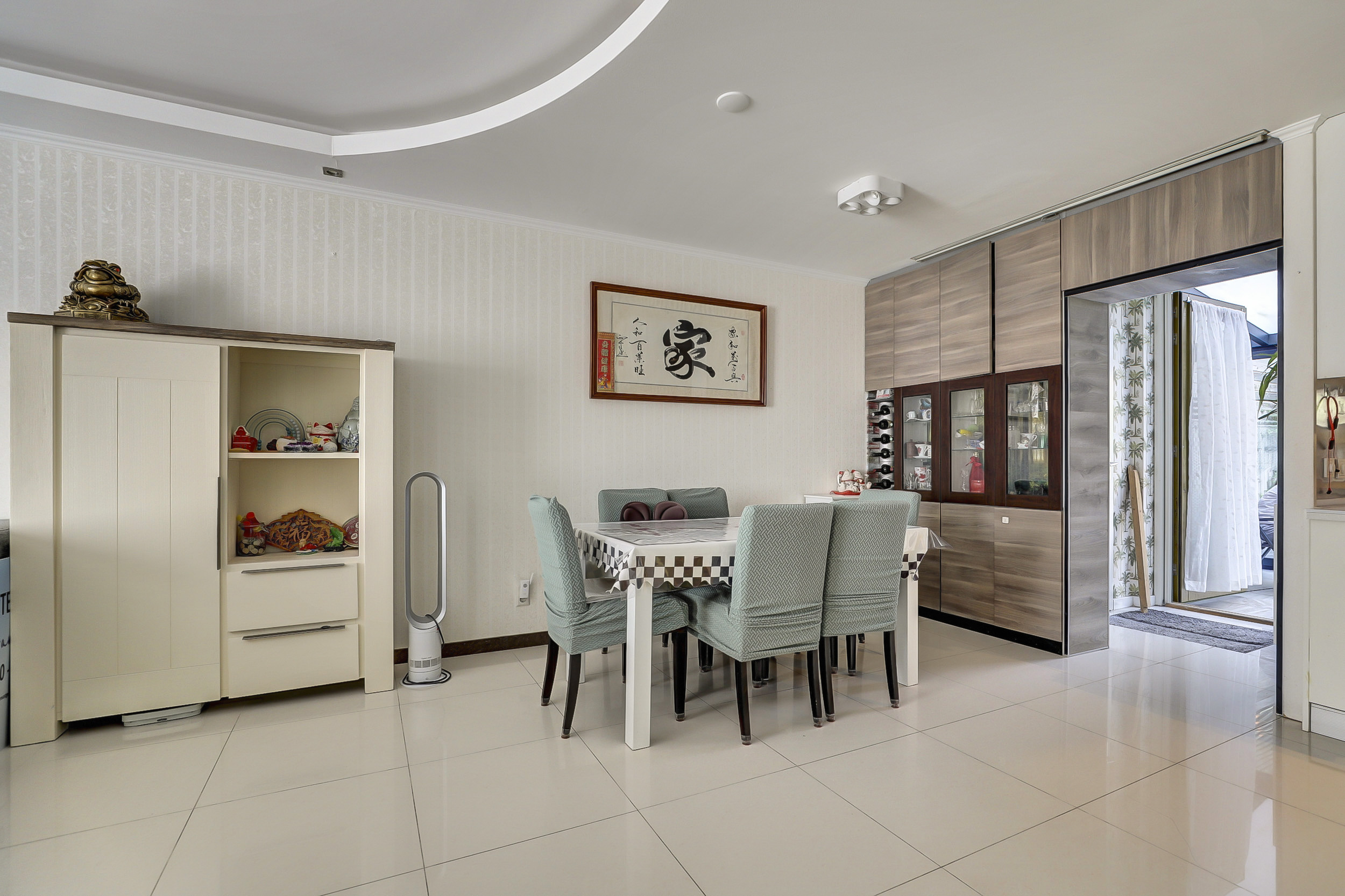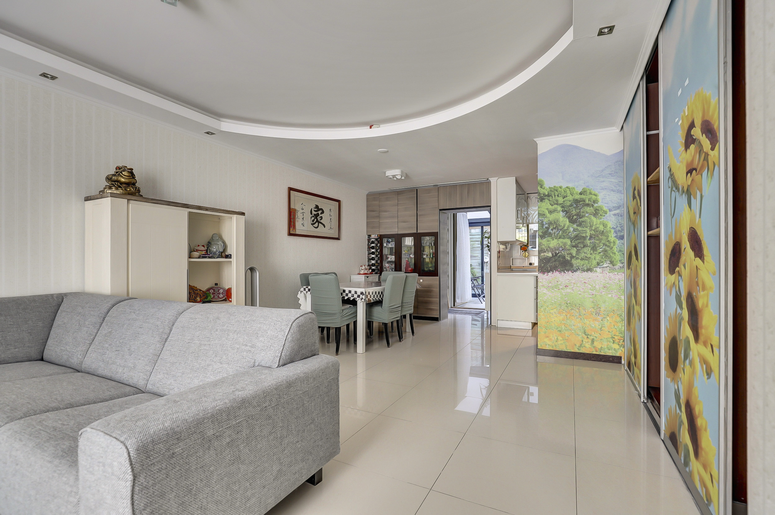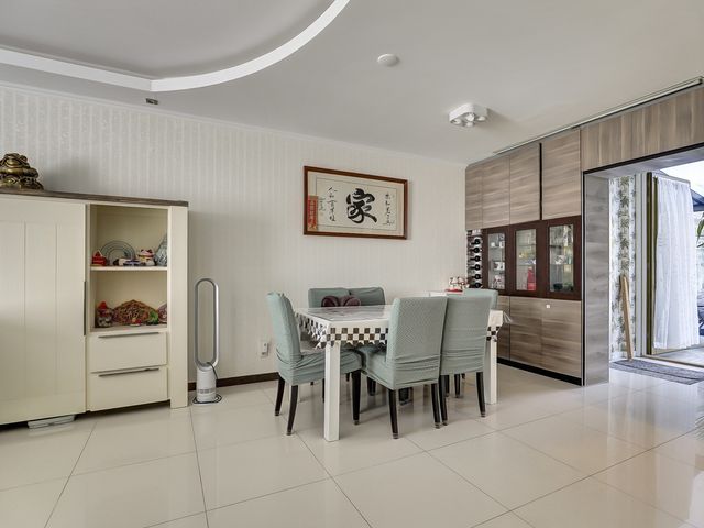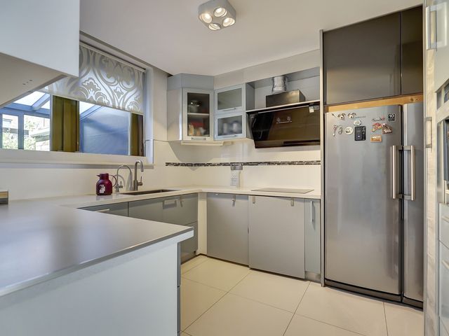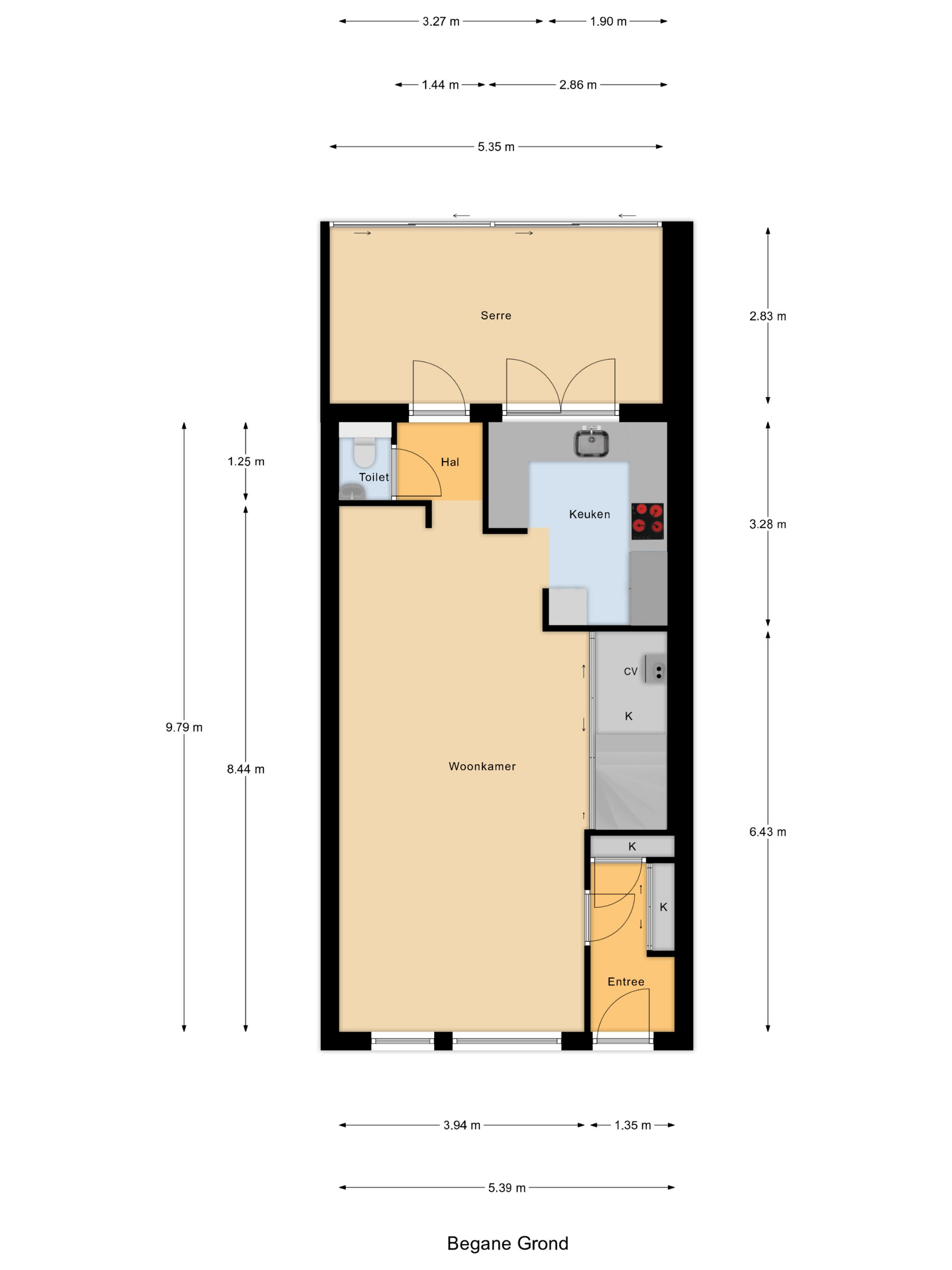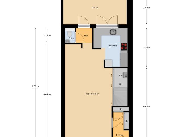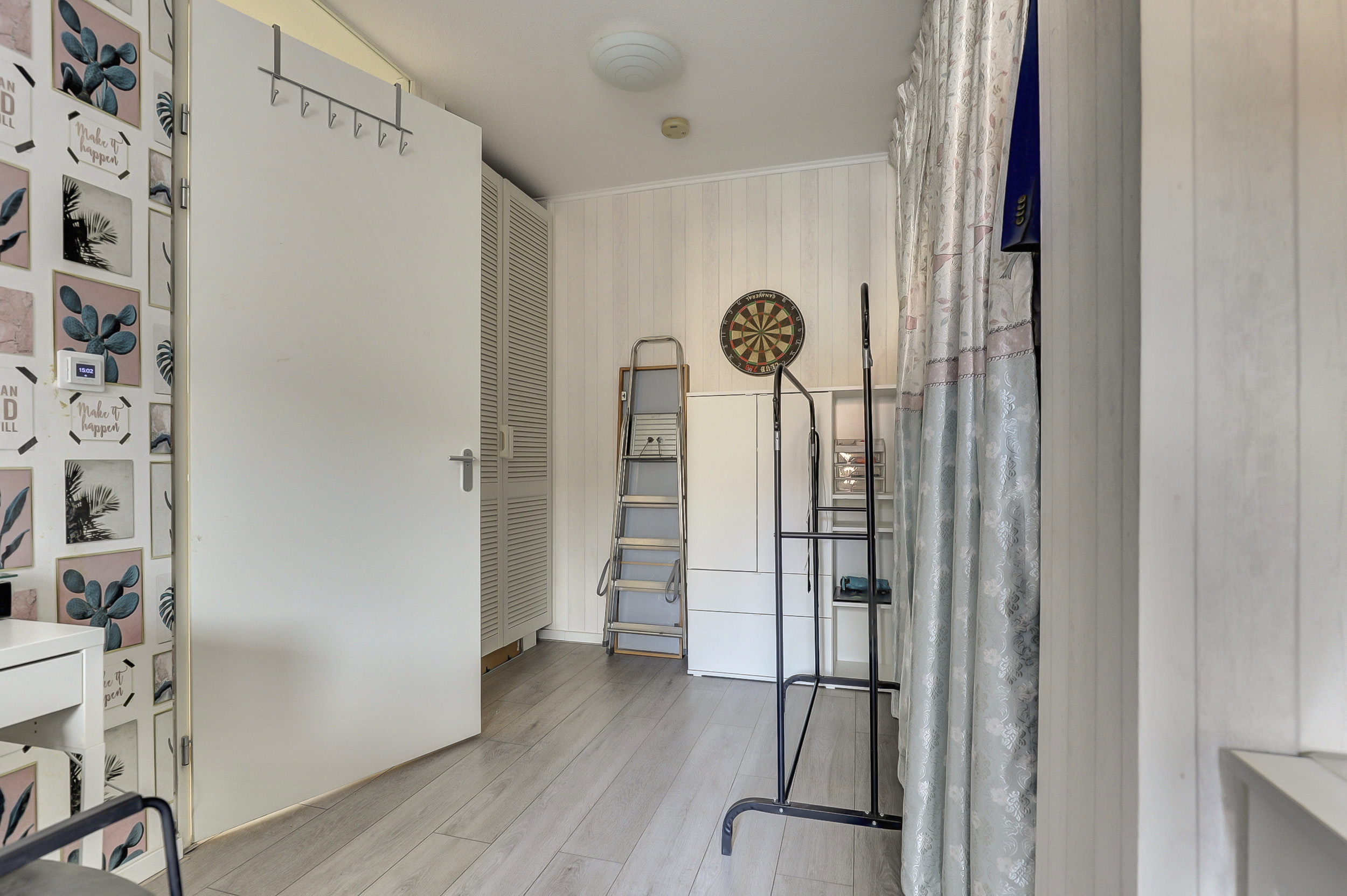 Vanuit de woonkamer kom je bij een tussenhal waar het toilet zich bevindt en je toegang hebt tot de serre. De serre is omgeven met glas en schuifdeuren en geeft je toegang tot de tuin.