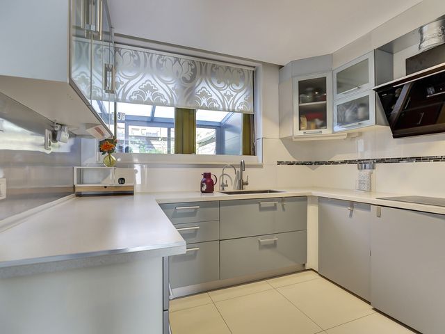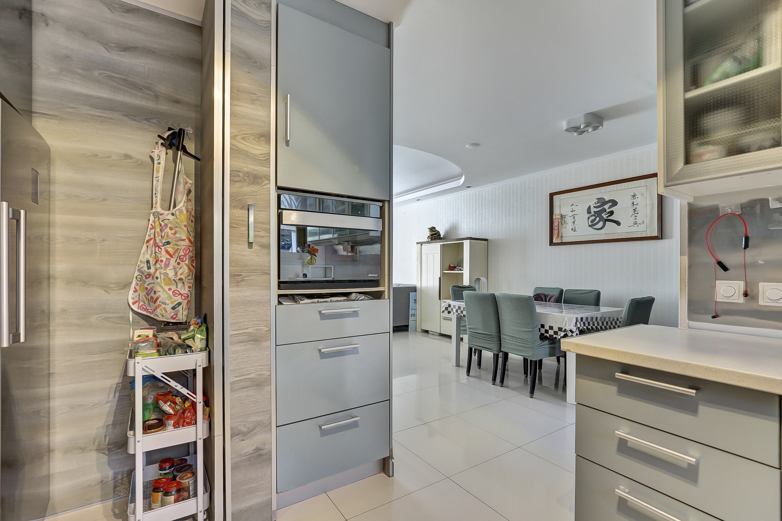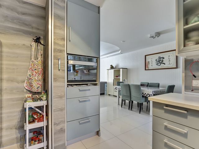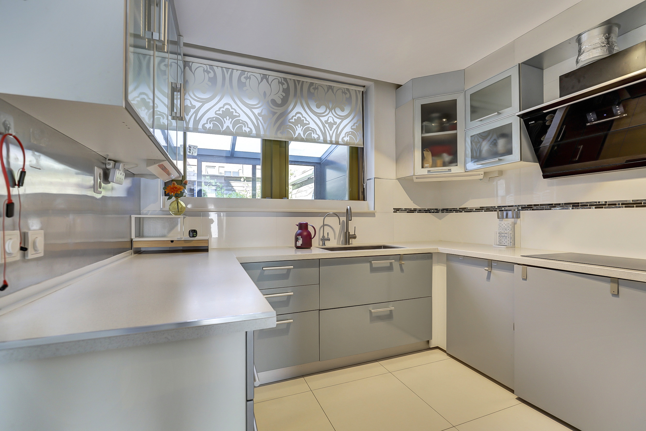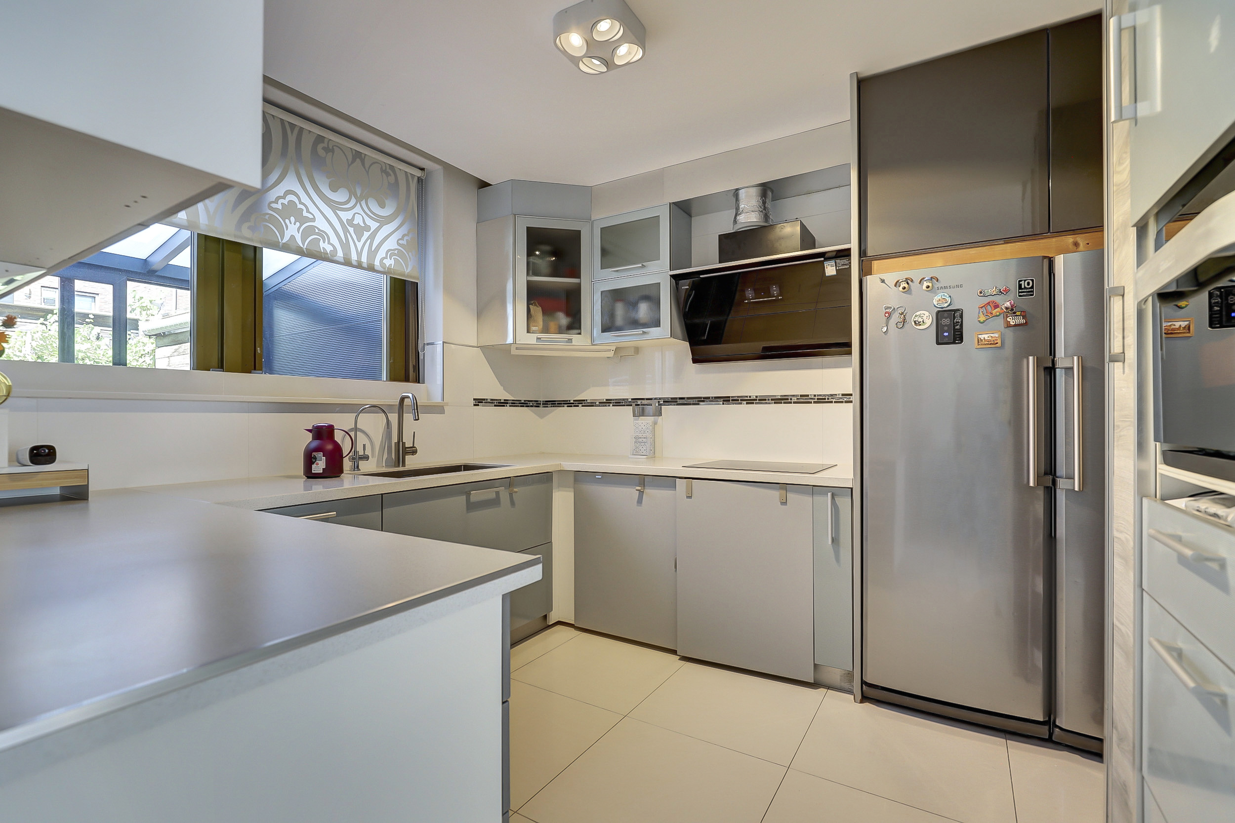 De half open keuken is eenvoudig opgesteld met veel kastruimte en beschikt over een koelkast, inductiekookplaat met afzuigkap, een heet water kraan, combi-oven en vaatwasser.