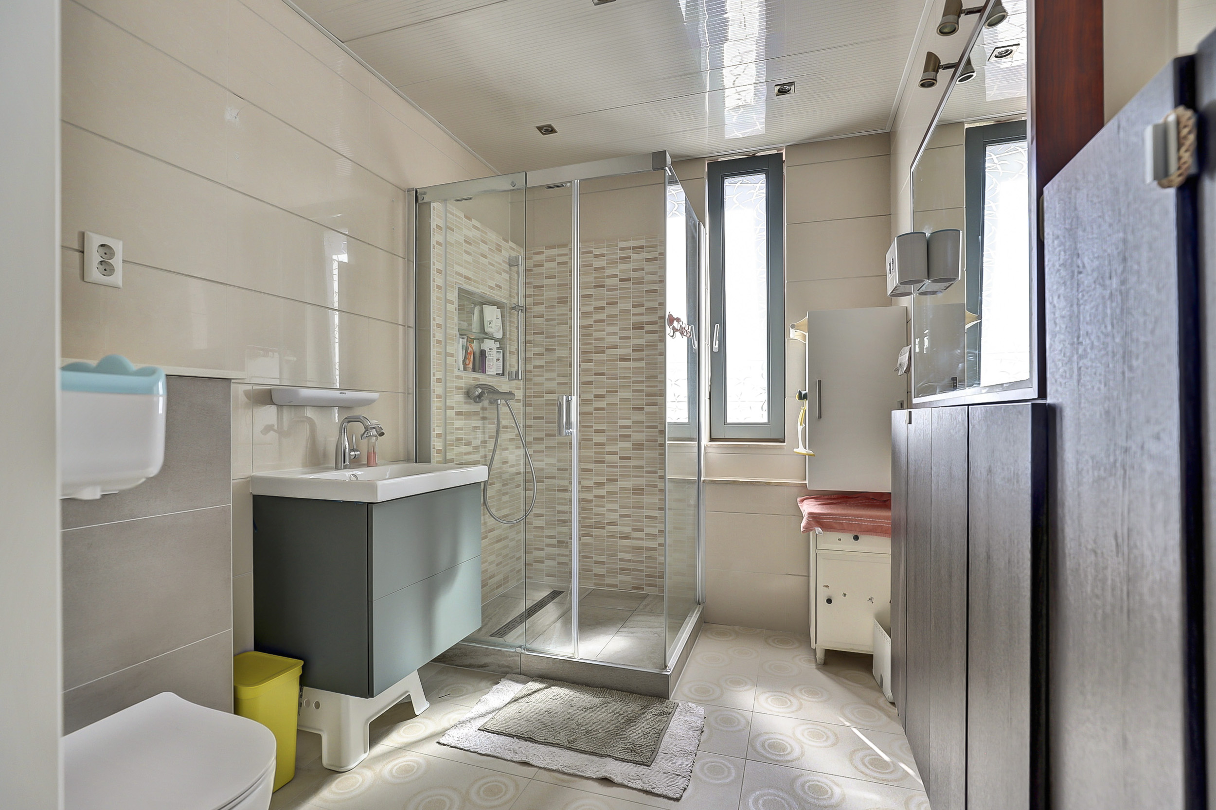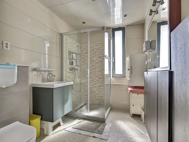 De badkamer is voorzien van een douche, toilet en wastafelmeubel.