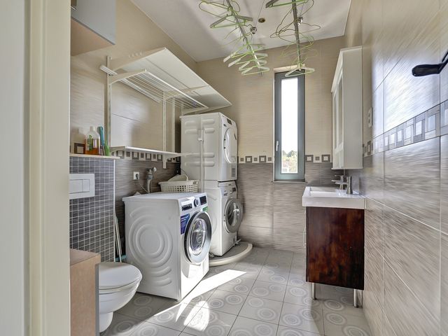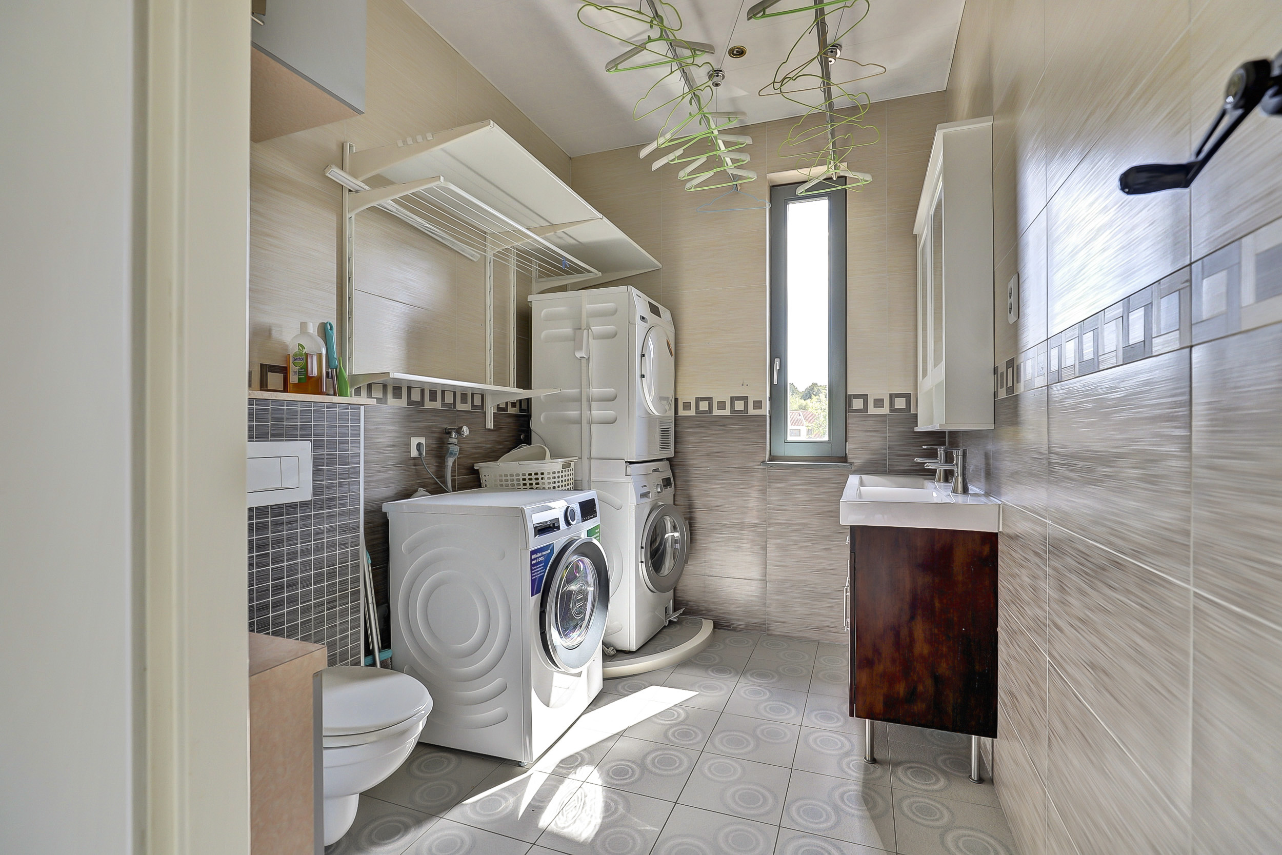 Bij de wasruimte is er een dubbele wastafel aanwezig en hier is de opstelling van de wasmachine/droger.