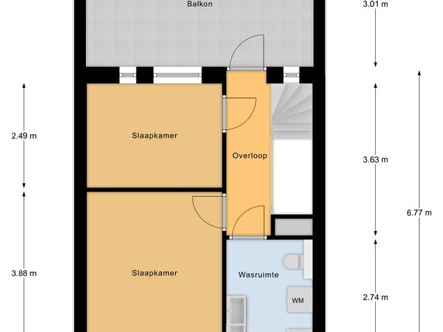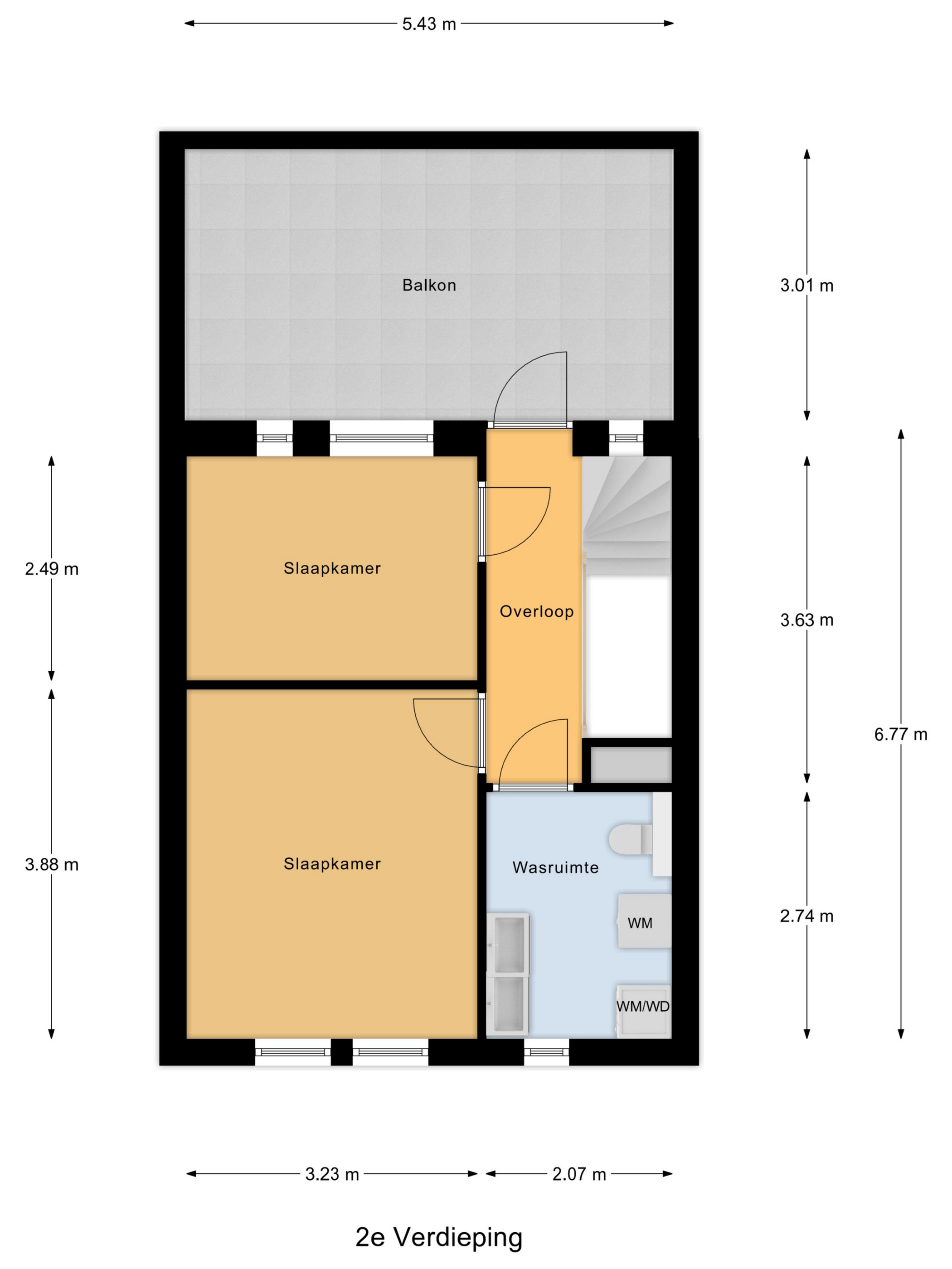 Vanuit deze verdieping heb je toegang tot het balkon (circa 16 m2), 2 slaapkamers en een wasruimte met toilet.