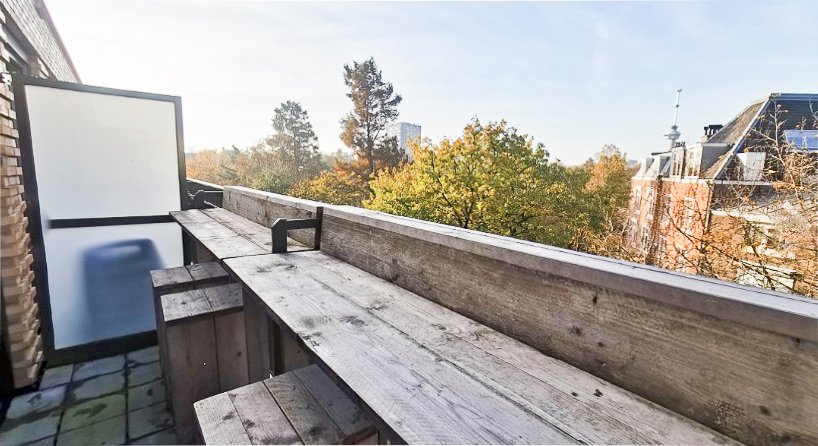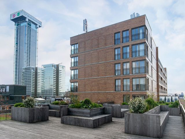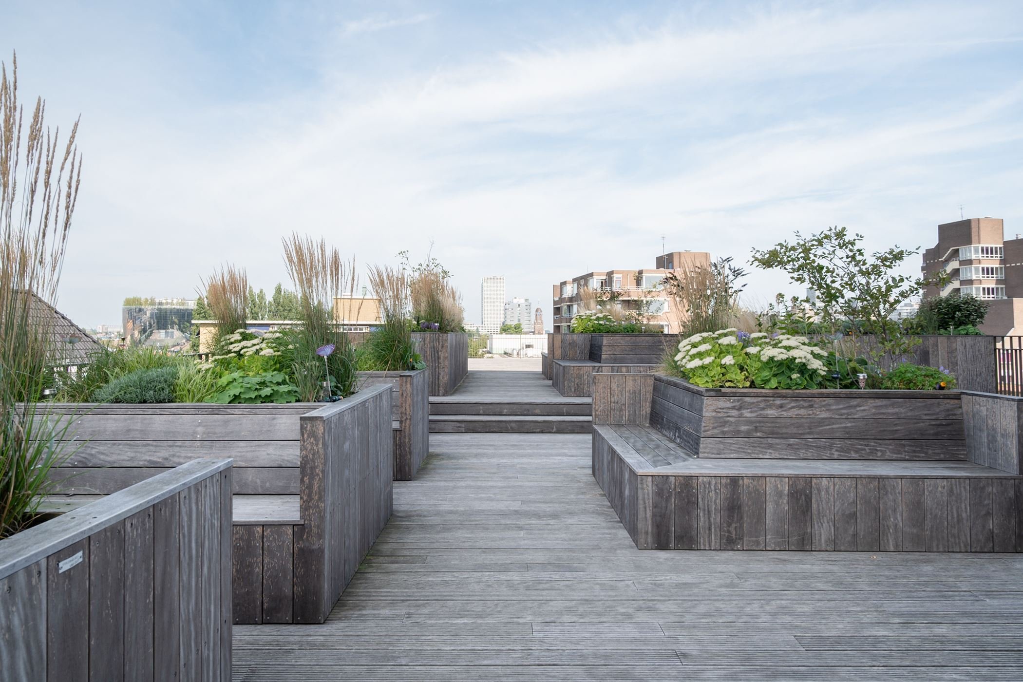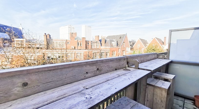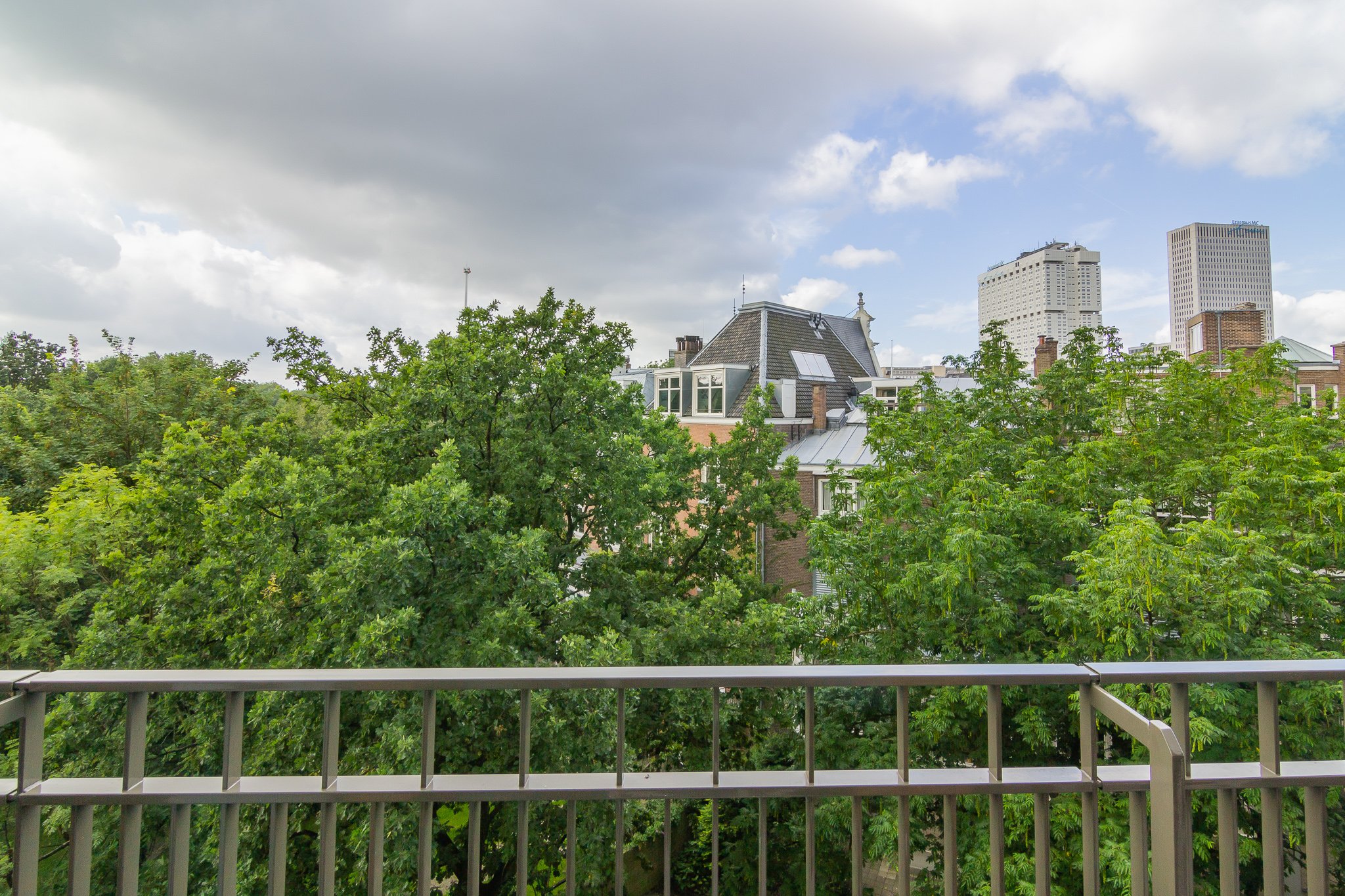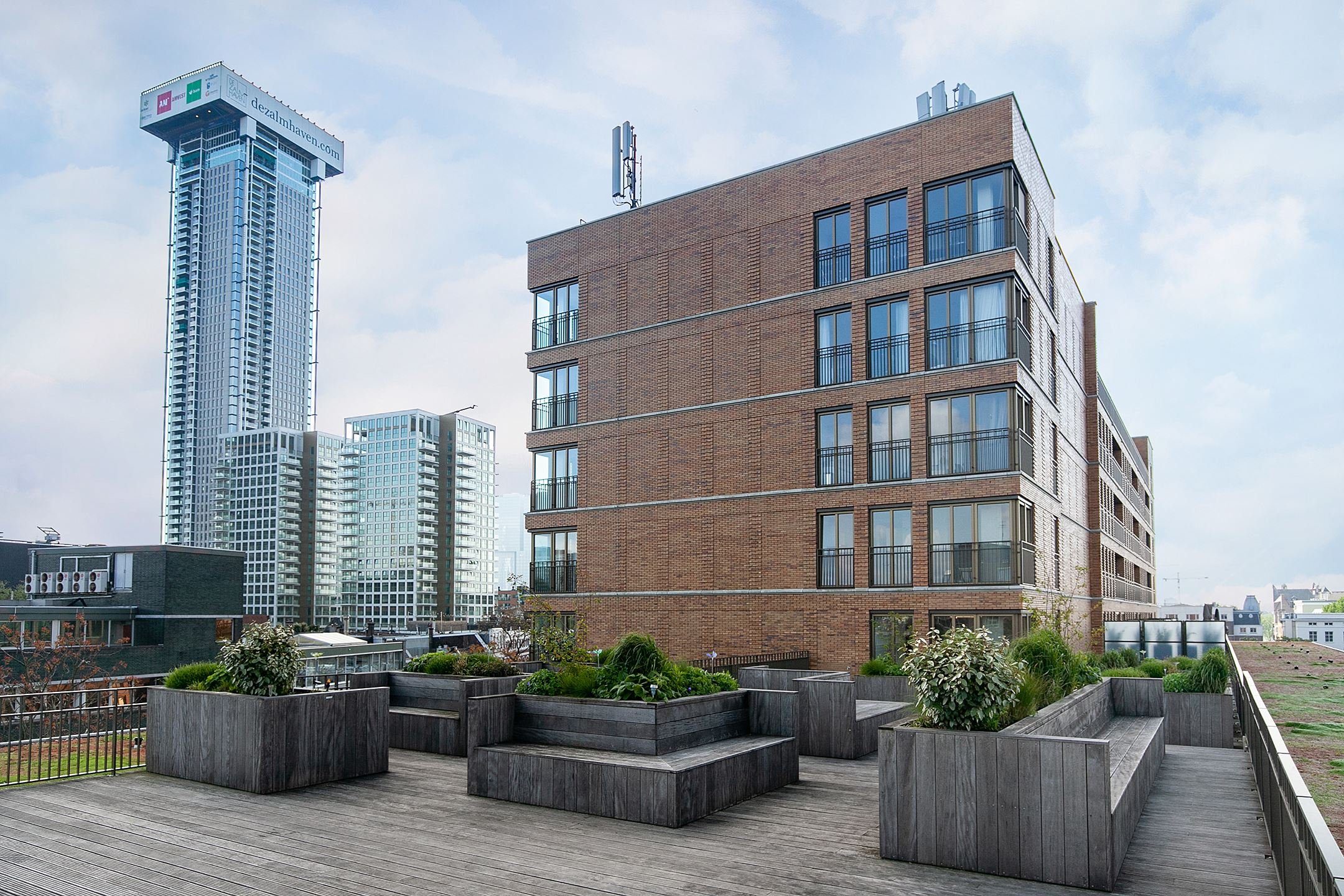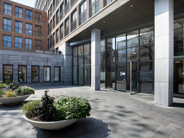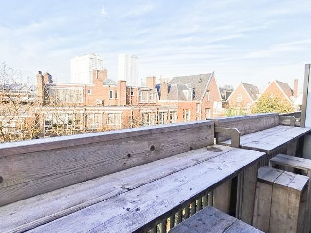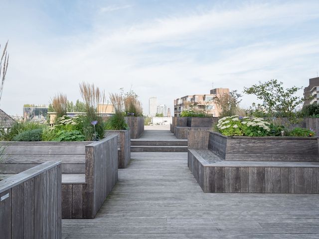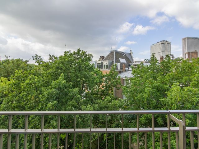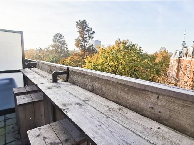 Op de 5e verdieping is een ruim gemeenschappelijk dakterras met zitbanken, stijlvolle beplanting en met weids uitzicht over het centrum van Rotterdam. Het is hier heerlijk vertoeven (zie foto's)!