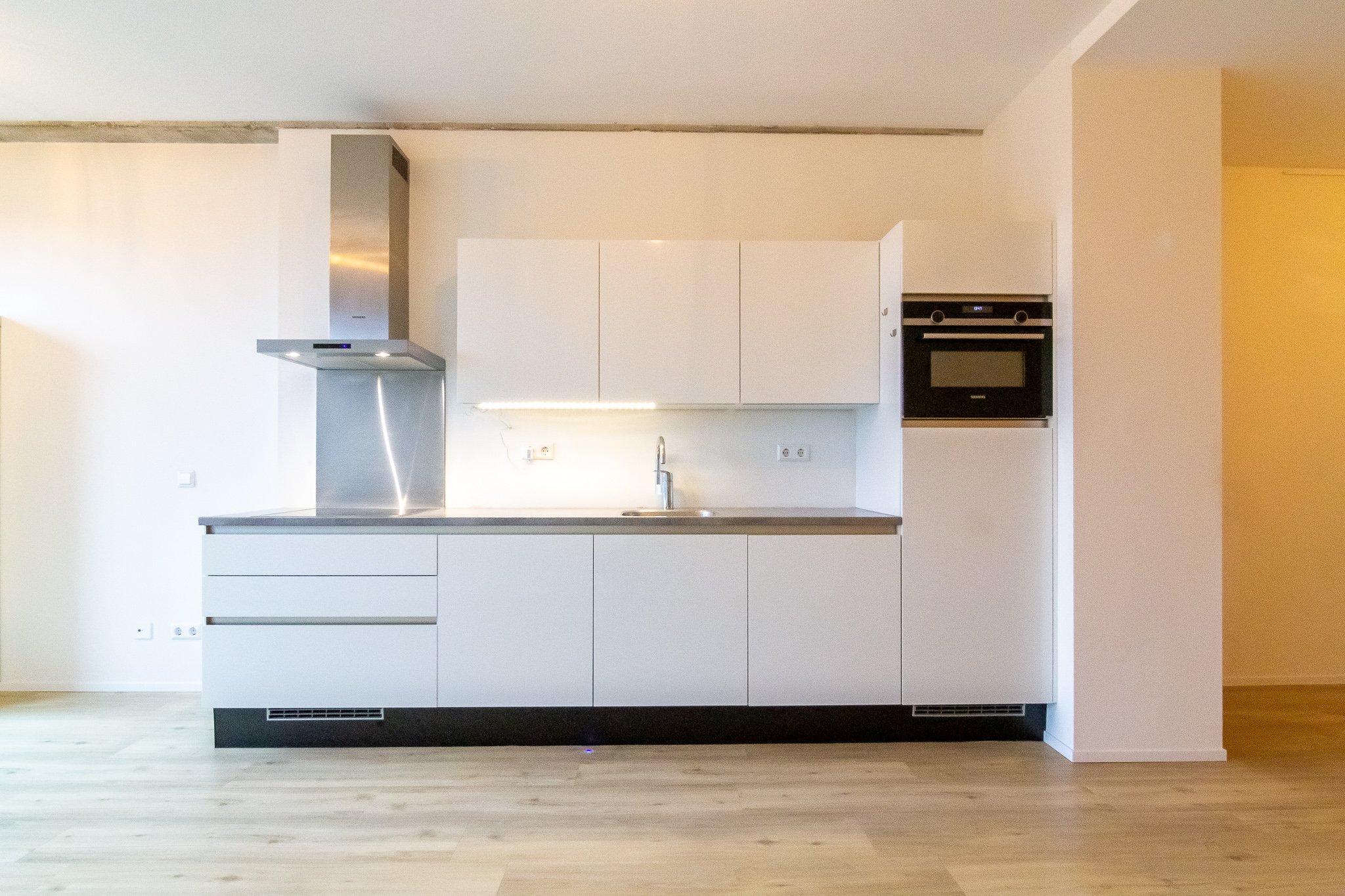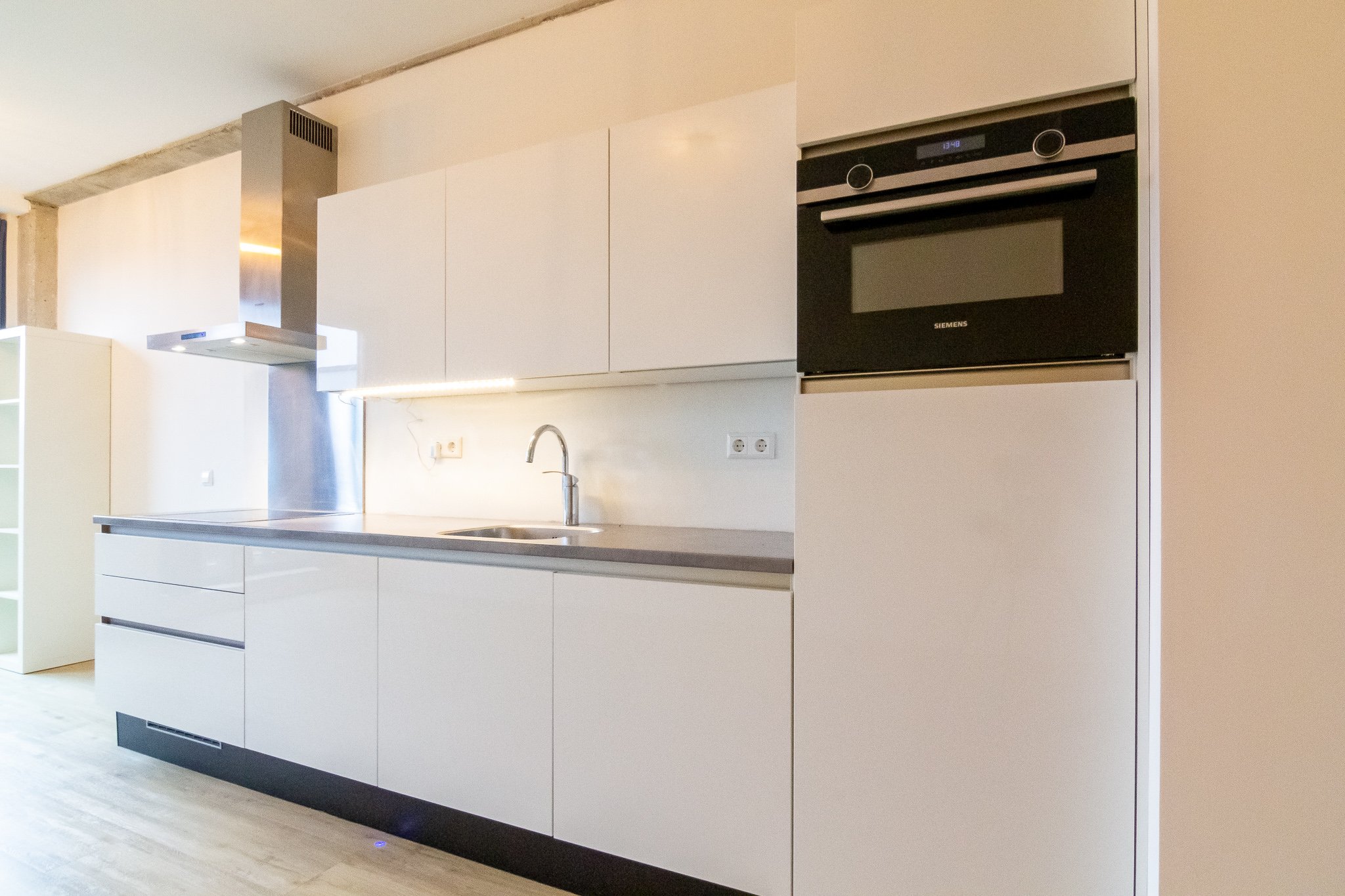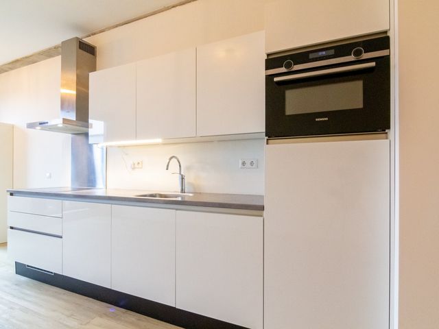 De luxe keuken is voorzien van een inductiekookplaat, afzuigkap, koelkast met vriesvak, oven, vaatwasser en voldoende kastruimte.